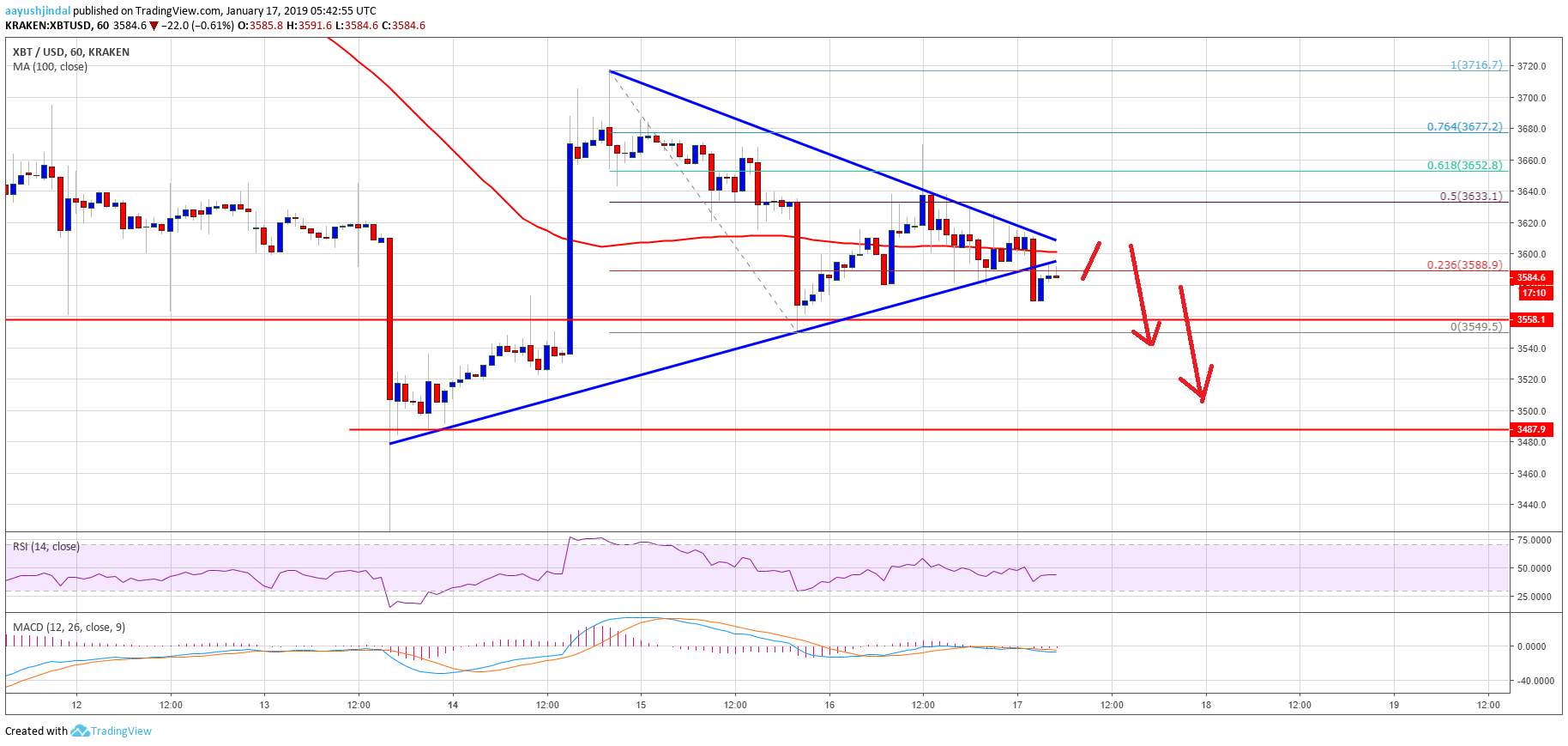 Looking at the chart, bitcoin price is showing a few bearish signs below the $3,620 and $3,650 resistance levels. Therefore, to start a decent upward move, the price must surpass the $3,650 pivot level. If not, there is a risk of a sharp decline below $3,500 and $3,450 in the coming sessions.